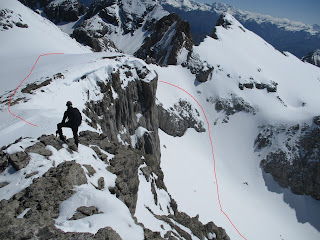 Descenso por la arista occidental, andando, y paso encíma de la salida del corredor Bu Bú que ascendí el pasado invierno. Es difícil y peligroso.