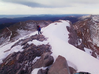 LLegándo al final del barranco Zicutar alcanzamos el Circo de Plan de Igüés con la mole de Peña Zarrambucho 2.575 m azotada por un fuerte viento del norte (70 kmtsxh) y a la derecha la esbelta Peña Gabacha 2.205 m con sus interesantes, aunque cortas, vías de escalada. Nuestro objetivo es el Collado Pilón de Acumuer (2.000 m) justo a la derecha de esta peña. 8 de diciembre de 2023. Alfredo, Javier, Nacho, Serbal y Jesús. Ampliar imagen haciendo click. Nieve escasa. LLevámos crampones.
